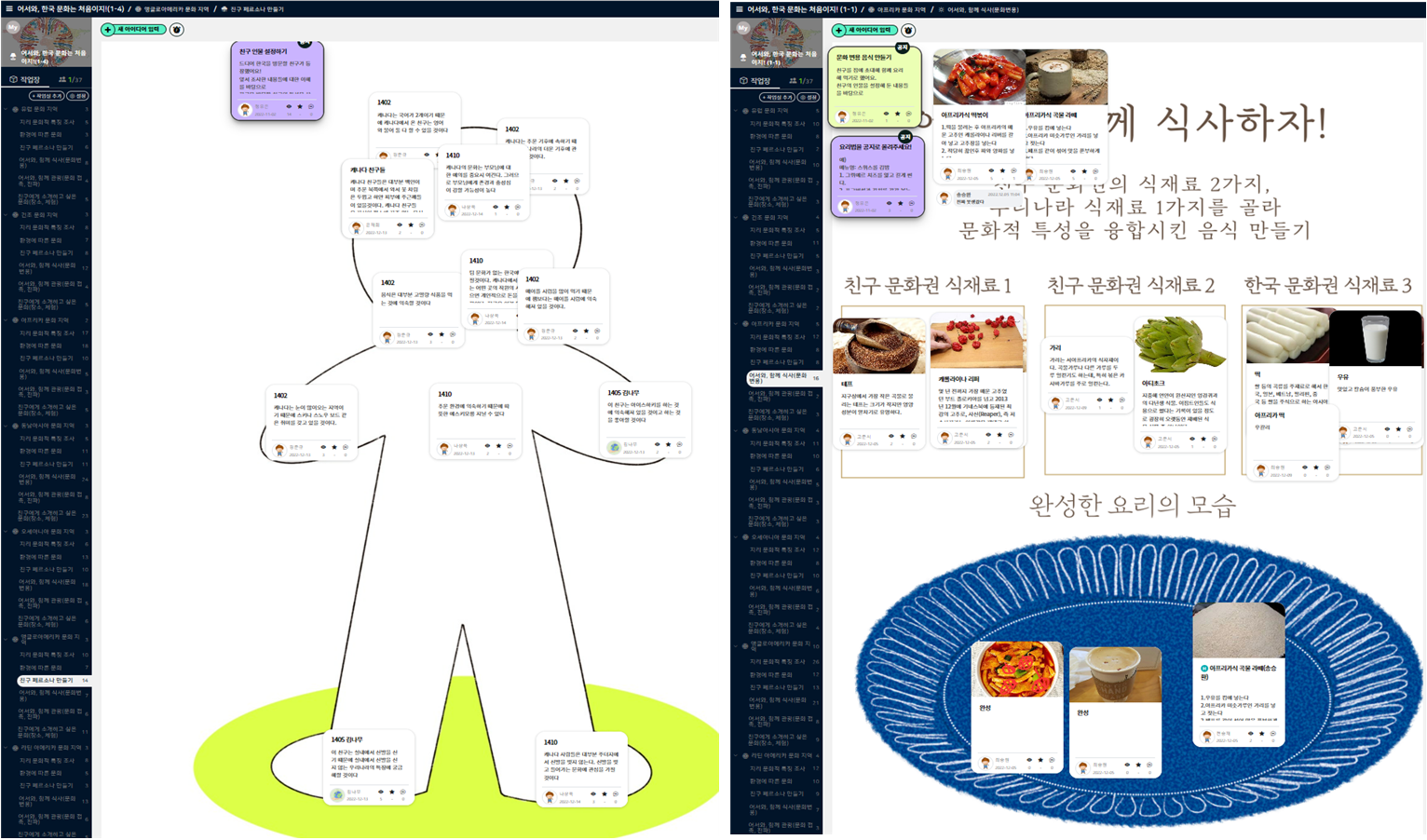 세부 활동 단계는 일곱 가지의 문화 지역으로 모둠을 구성해 문화 지역의 특성을 조사하고, 조사한 내용을 분석하여 자연 및 인문 환경에 따른 특수성을 탐구하는 활동이었습니다. 그리고 문화권의 특성이 담긴 친구를 가상으로 설정하여 이 친구가 한국에 온 것을 가정하고 문화 변용의 원리를 담은 음식 만들기, 문화 접촉 및 전파의 사례 찾기, 한국 문화의 특수성이 담긴 장소나 체험 소개하기 활동을 하였습니다.