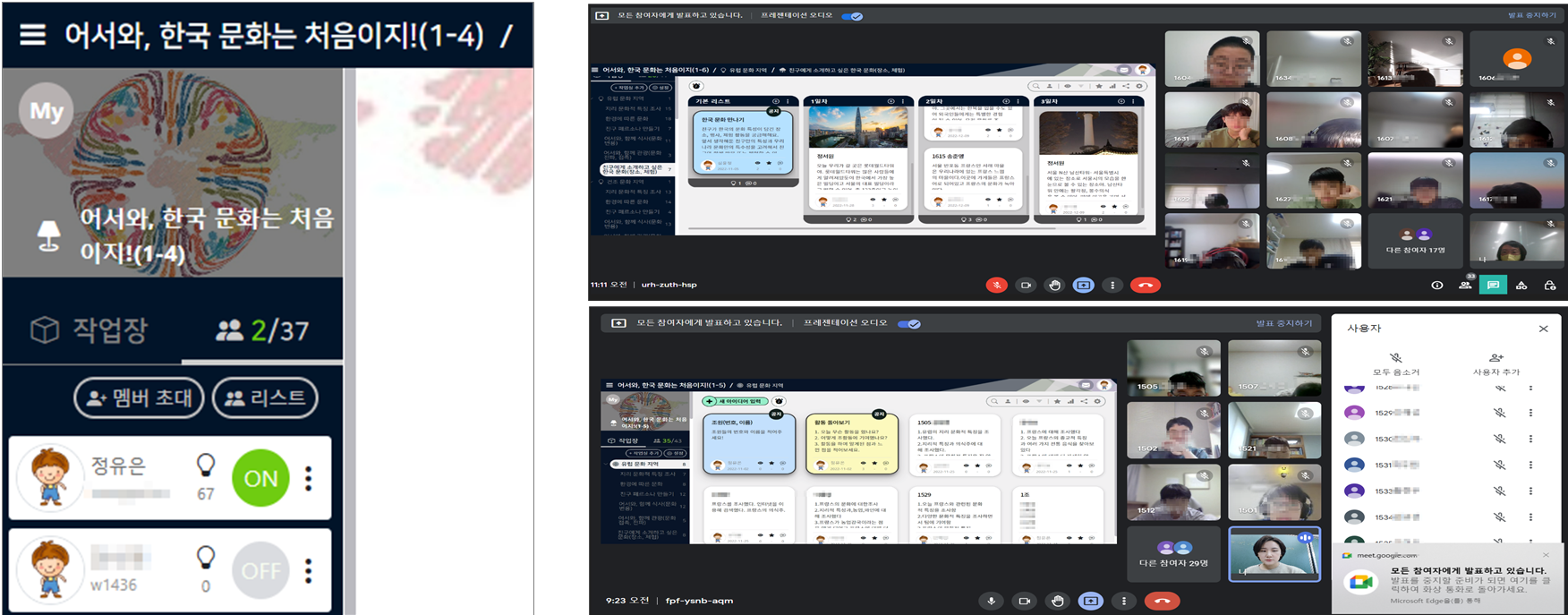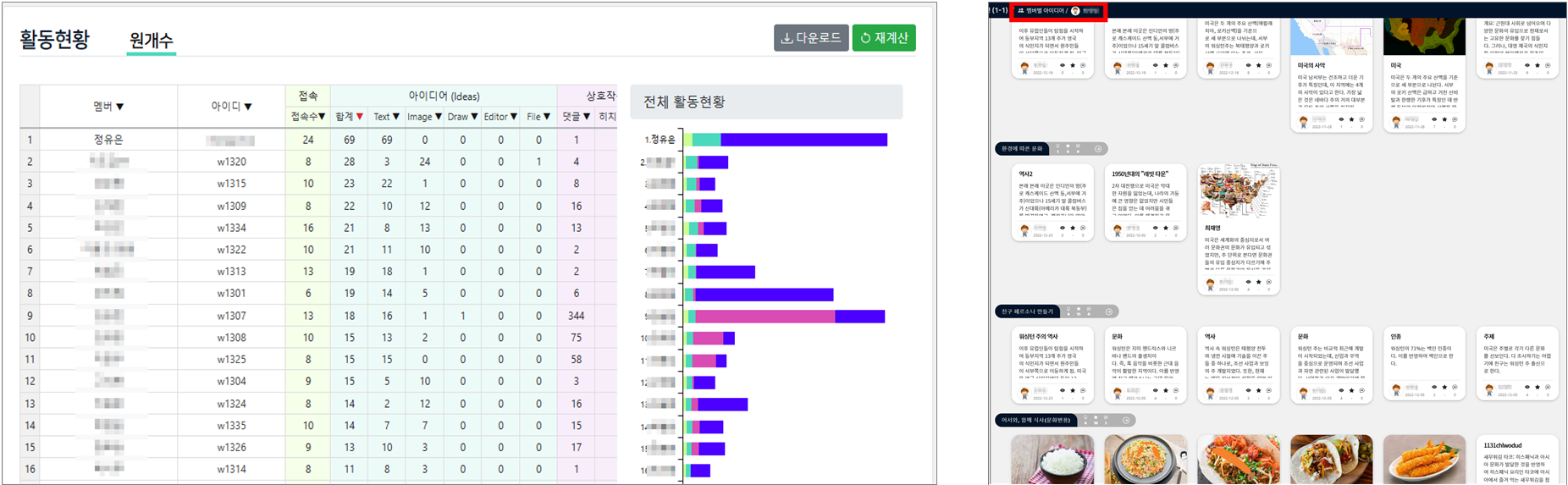 처음에는 학생들이 수업 시간에 전자기기 화면을 바라보는 것만 보이니 걱정되기도 했지만, 와우아이디어스 플랫폼은 학생들이 현재 로그인하고 활동하는지를 [자료2]와 같이 한눈에 알 수 있어 오히려 지면 활동지를 사용하는 때보다 교실 중앙 전면에서 반 전체를 파악할 수 있었습니다. 그리고 이 기능 덕분에 온라인 수업 전환 시에도 일관되게 프로젝트 활동을 진행할 수 있었습니다. [자료3]과 같이 학생들이 로그인하고 어떤 게시물을 올리고 있는지 바로 볼 수 있다는 점이 무척 편리하고 유용했습니다.
