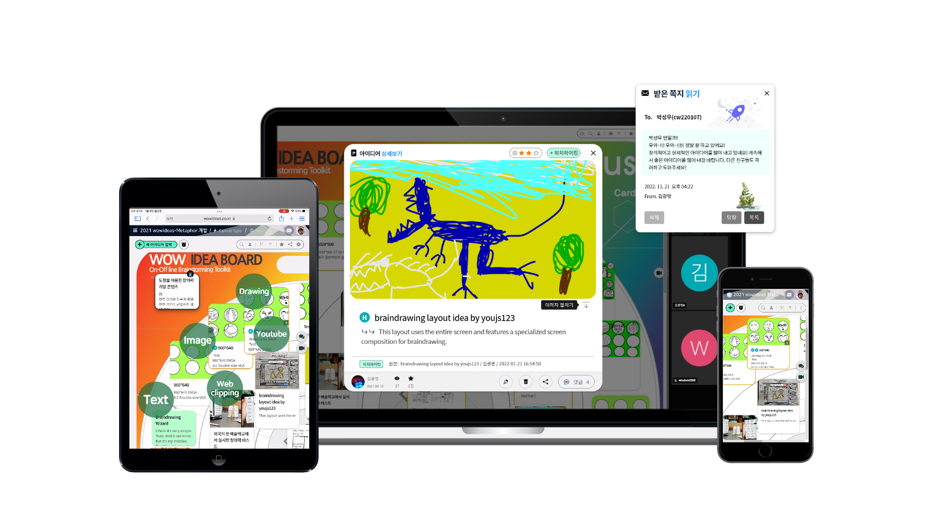 글, 그림, 스케치, 인터넷 기사 또는 자료, 유튜브 영상 등을 이용한 풍부한 매체로 아이디어 발상이 가능합니다.