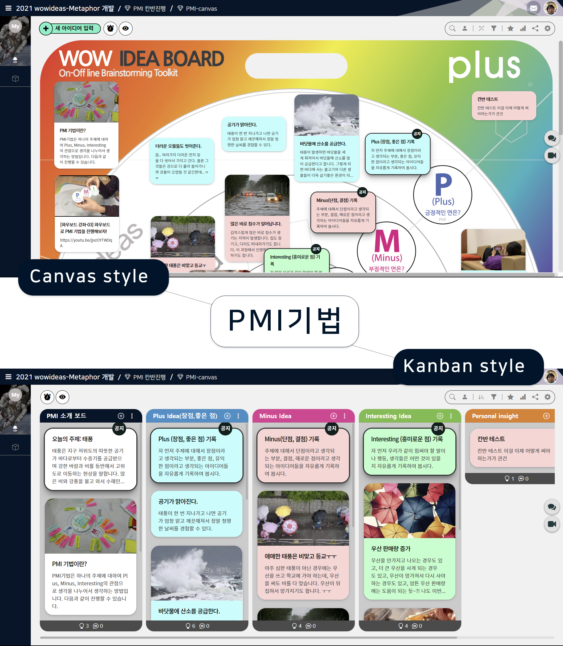 - PMI 기법 예시: 태풍에 대한 PMI (하나의 아이디어 소스로 Canvas style or Kanban style UI 표현 가능)