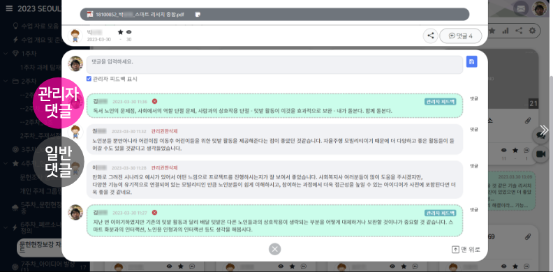 & 댓글이라고 다 같은 댓글이 아니다?! 관리자 댓글을 지원하여 선생님의 피드백이 분명하게 구별되게 제시되도록 합니다.