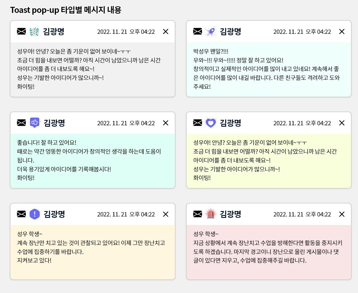 [칭찬], [격려], [위로], [경계], [경고]의 각 상황에 맞는 메시지 타입을 구성하여 바쁜 수업 중간에도 빠르게 쪽지를 보낼 수 있어요!