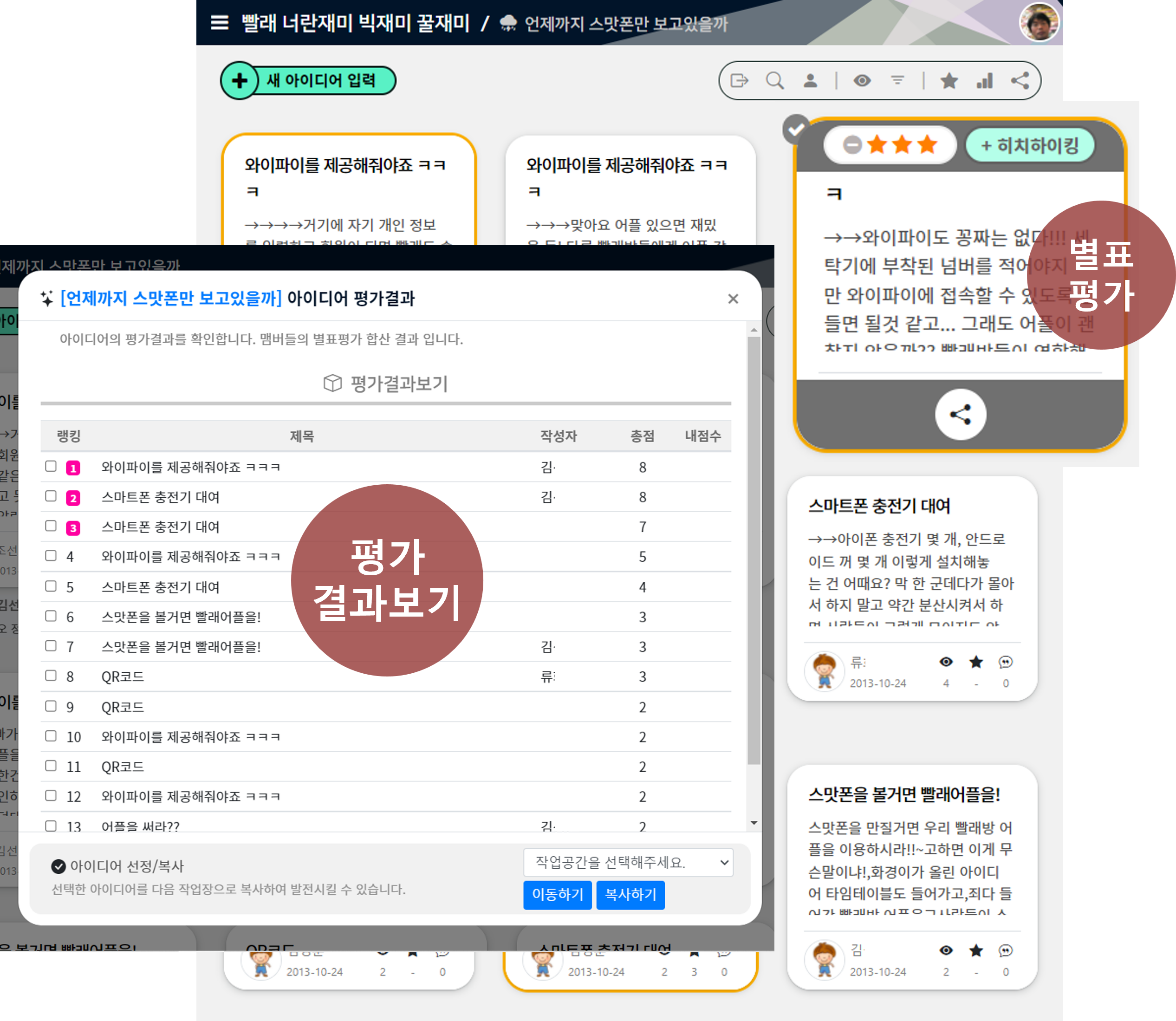 아이디어 상단의 별표치기로 간단하게 다중투표(Multi-voting)를 할 수 있습니다. 쉽게 합리적인 의사결정 과정 진행~!